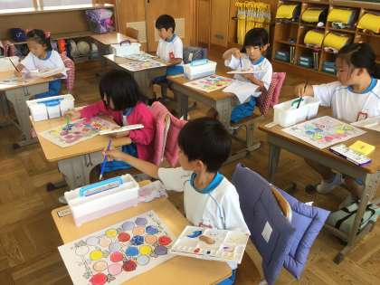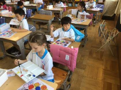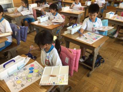 初めての絵の具の学習です。道具の名前から、使い方、色の塗り方などみんなで学びました。