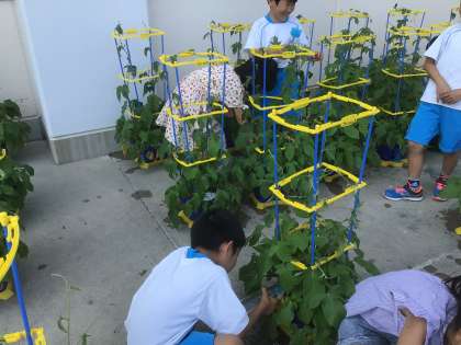 つるが、支柱の外にいかないようにやさしく誘引しました。ちょっとひっぱりすぎてつるが切れてしまうと「ごめんね」と、声をかけていましたよ。とっても大事に育てています。