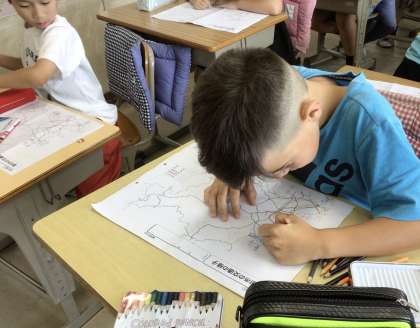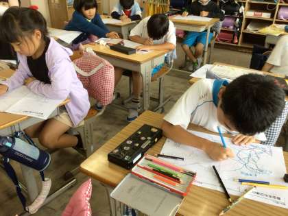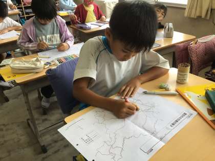 2組の様子です。豊田市の特徴が分かるように白地図に色を使い分けながら塗っていました。