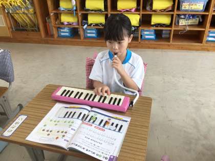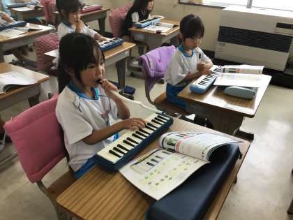 けんばんハーモニカの学習を始めました。 正しい姿勢で、よい音が出せるよう練習しています。