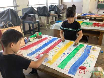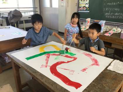 家から持ち寄ったカップやネット等に絵の具をつけて、大きな紙にぺったん!