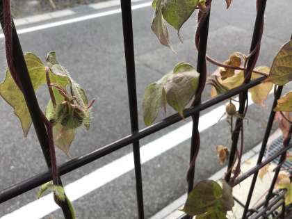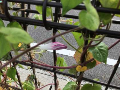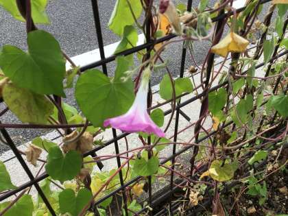 正門の左側に、5年生が育てているアサガオの花が咲いています。出来始めの種子を見ることもできます。
