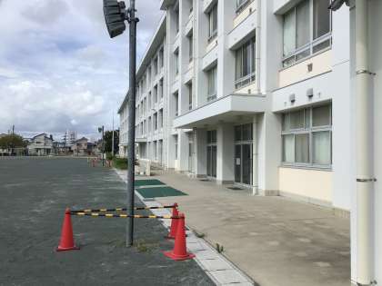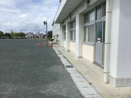 アサガオの花壇を通り抜けると運動場が見えます。右に曲がると昇降口が見えます。