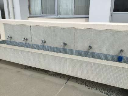 明日から登校する東昇降口付近です。1年生がアサガオの水やりで使った手洗い場があります。