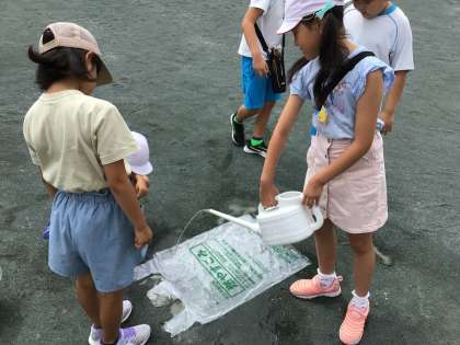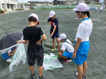 「雨水のゆくえ」の学習で、地面の様子と水の流れにはどのような関係があるのか観察しました。