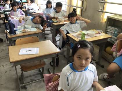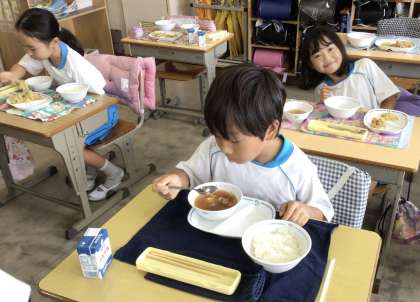 今日のメニューは、ご飯、冬瓜スープ、とりにくの香味ソースかけ、かふう和え、牛乳でした。今日も美味しくいただきました。