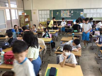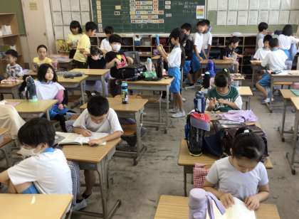 今朝の様子です。浄水小の雰囲気をさらによくするために、朝の挨拶ボランティアを続けています。教室では、朝の準備をしています。今日は、算数のテストがあるので、テスト勉強をしている子もいます。