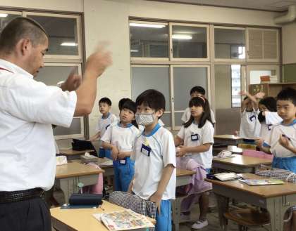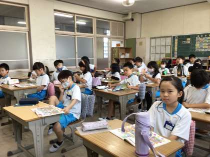 外国語の授業です。ALTの先生も参加して、身近にあるアルファベット見つけに取り組んでいました。