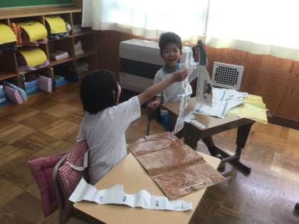 家から持ってきた包装紙や広告で、紙を破ったりちぎったりして楽しみました。自然にできた形を見て、想像をふくらませました。
