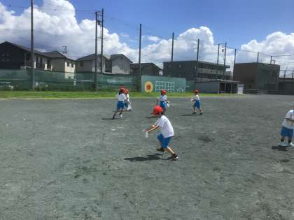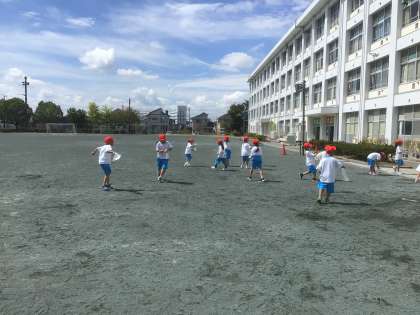 水遊びは、楽しいね。ビニール袋に穴をあけて、地面に絵を描いたり友達と水をかけあったりして遊びました。