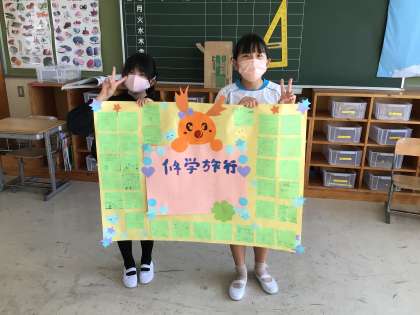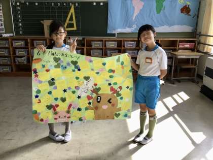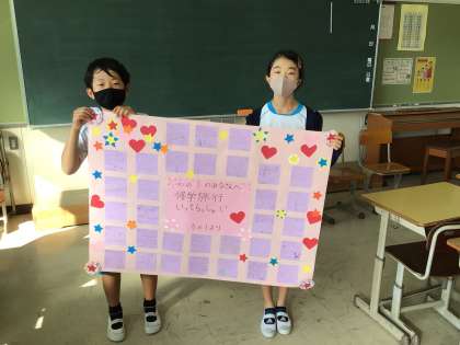 6年生へ向けて、5年生がメッセージを書きました。それを実行委員の人たちが飾り付けして、6年生に贈りました。修学旅行楽しんできてくださいね。