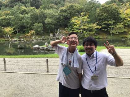 天龍寺を見学しました。「平和観音と愛の泉」でカエル像の前のお皿にお金が入るか挑戦しました。