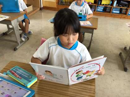 「かいがら」の学習の最後に、自分が好きな本を選び、紹介し合う活動をしました。お気に入りの絵本を選び、発表ノートにおすすめの理由をまとめ、意見交換をしました。お互いに読み聞かせたり、気持ちを考えながら読んだりと、楽しく交流しました。