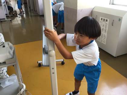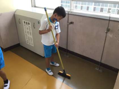 3組の掃除です。教室前の廊下を丁寧にほうきでごみを集めたり、雑巾で床を隅々まで拭いたりして綺麗にしています。ホワイトボードを綺麗にしてくれていた子もいました。より綺麗にするために掃除の仕方も自分で工夫しながら行っていました。