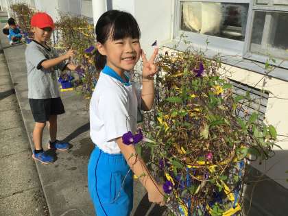 まだまだ暑い日が続いていて、アサガオに水やりをしていました。たくさんの花が咲いている鉢やたくさんの種子ができている鉢もあります。毎日の丁寧なお世話のおかげで、今でも素敵なアサガオの鉢を見ることができます。