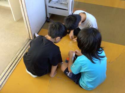 糸が絡まりやすく、絡まった糸をほどいている子もいました。実験が終わった子は、糸電話を増やして4人での会話をしていました。