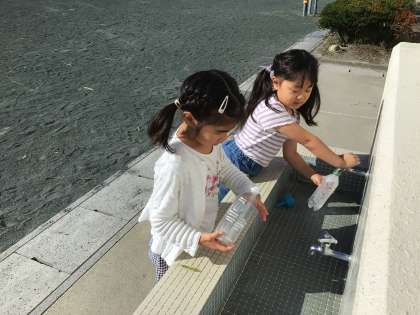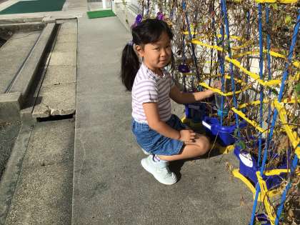 今朝も天気が良かったです。アサガオに水やりをしている1年生です。水をそっと優しくあげていました。素敵な1年生です。