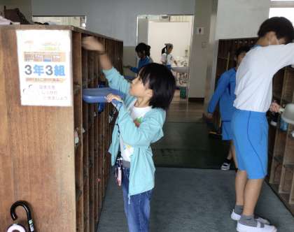 無言で一生懸命にゴミを集めています。トイレも力強く磨いています。一生懸命に掃除をする3年生です。
