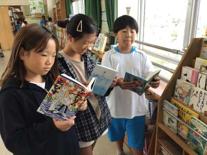 休み時間には、多くの子が図書館で本を読んでいます。4年生は、1年間で60冊以上読むことを目標としています。多くの子が達成できるといいですね。