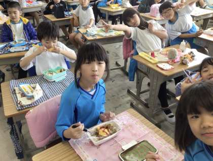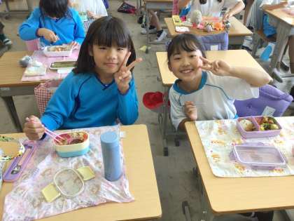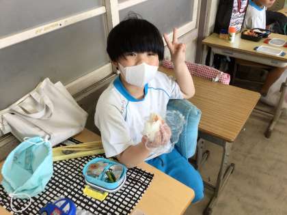 学年レクリエーションが行われた日は、給食ではなくお弁当でした。とても素敵な笑顔で食べていました。