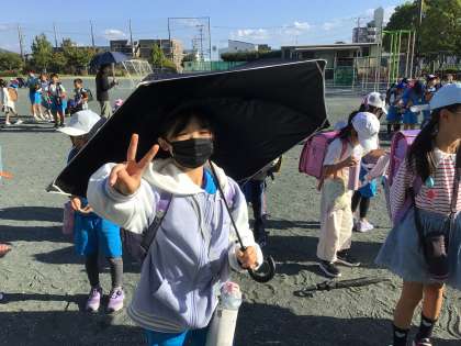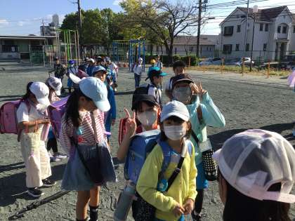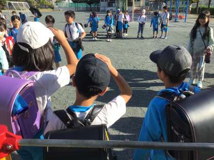 鉄棒前では、後期の学級委員が整列の声掛けをしています。朝は、涼しかったですが、下校する時は、暖かかったです。