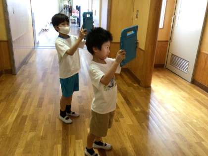 校内にあるユニバーサルデザインやバリアフリーの物を探して、学習用タブレットで写真を撮りました。撮った写真を使って気付いたことを発表ノートにまとめました。