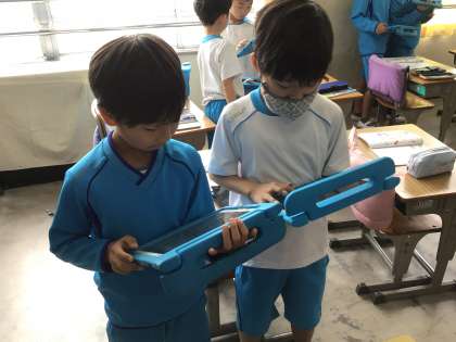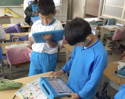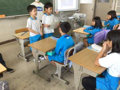 後期、初めての授業です。新しい外国語係が、みんなの前で天気や曜日などを英語を使って質問しました。今日は、自分の好きなものを友達に紹介しました。