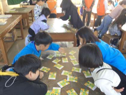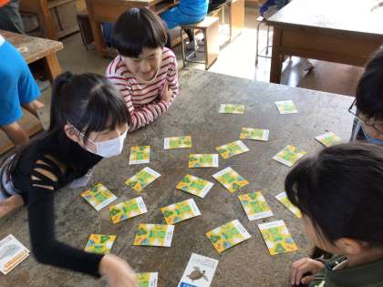今日はエコットから講師をお招きして「カッパの清吉と海ごみのルーツを探ろう!」という授業を行いました。始めに、海に関係するもののカードゲームをしました。