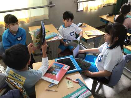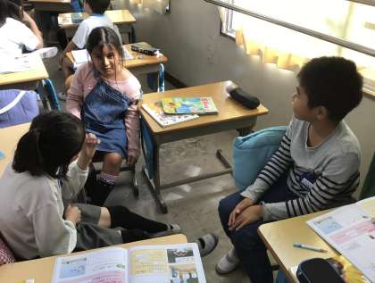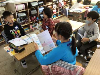 かげのでき方と太陽のいちについて、前の授業で観察したことをグループで話し合いました。太陽の反対の向きにかげができることに気づきました。