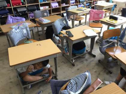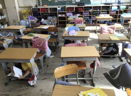 地震発生を想定した避難訓練が行われました。長放課中でしたが、自分の判断で地震発生の放送が流れると急いで机の下に身を隠すことができました。