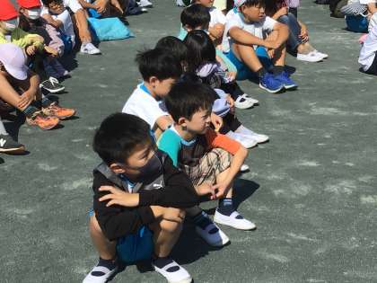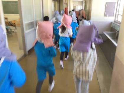 「避難して下さい」との放送が流れると、頭を守るために防災頭巾を被って静かに運動場へ移動しました。運動場へ出ると急いでクラスごとに番号順に整列しました。とても短時間で避難完了しました。よくできた3年生でした。