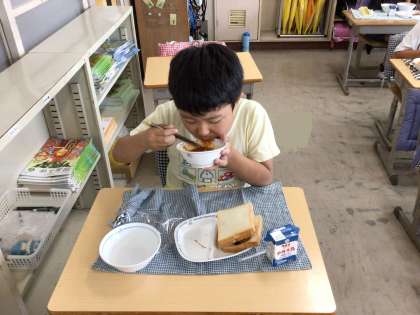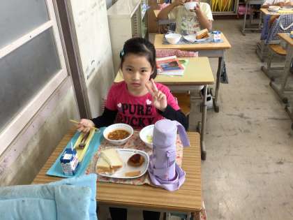 この日も美味しくいただきました。この日のメニューは、スライスパン、ポークビーンズ、エビカツ、りんごサラダ、牛乳でした。りんごサラダが1番人気でした。