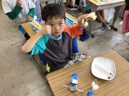 エビカツをスライスパンで挟んで食べている子もいました。どの子も口を大きく広げて美味しそうに食べていました。