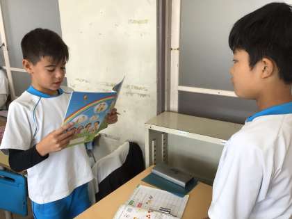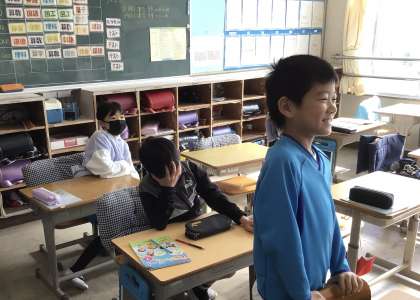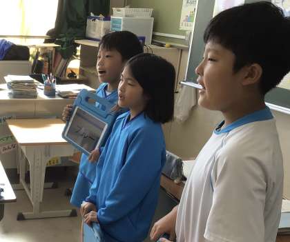 みんなの前にいる友達の好きな色を予想して英語を使って表現しています。予想が外れた子は、とても悔しがっていました。