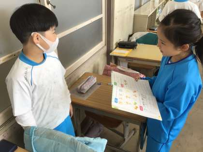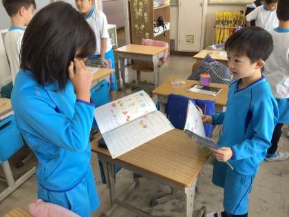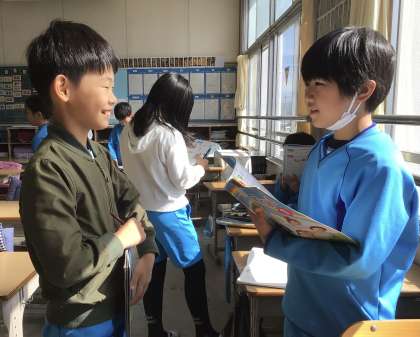 次は、ペアを組んでペアの友達の好きな色を予想しました。色以外に好きな果物やスポーツも予想して英語を使って答えていました。予想が当たった時には、英語で喜びを表現していました。