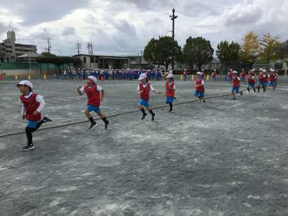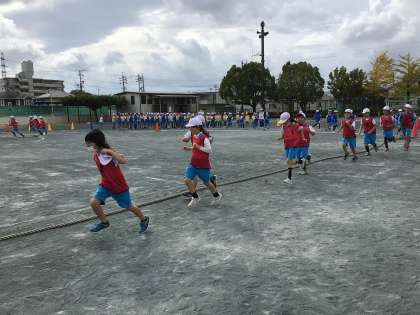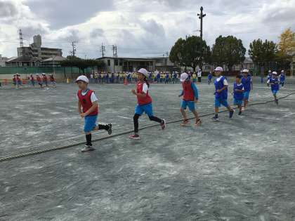 今日の3時間目です。綱引きの入場の様子です。赤色のビブスは1組です。