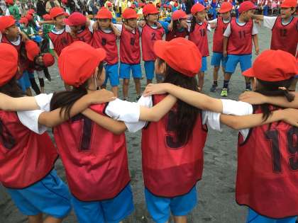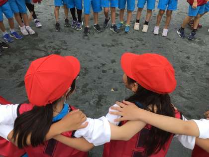 リレーの前にクラス一丸となって気持ちを高めていました。