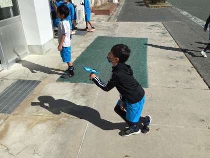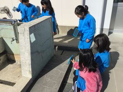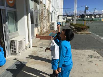 テストを返却した後に、太陽の光の学習を行いました。鏡を使って太陽の光を跳ね返して気付いたことを話し合いました。朝は曇っていましたが、3時間目には晴れて観察することができました。