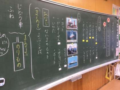 「なかまになることば」の学習です。自動車のなかまや、果物のなかまを集めました。集めたものが、さらに食べ物や乗り物というなかまになることに気付きました。
