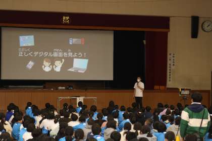 11月16日(木)5時間目に、第1回学校保健委員会を行いました。学校法人日本教育財団 名古屋医専から、視能訓練士の加藤権治先生をお招きし、「デジタルデバイスが与える目への影響と対策」についてお話ししていただきました。ご自身の体験や最新の情報を子どもたちに分かりやすく伝えてくださいました。おかげで、これまでの生活を見直し、目を大切にしようという意識を高めることができました。また、保健委員会の子どもたちが作成した「愛eyeダンス」をみんなで踊りました。学校保健委員会で学んだことを忘れず、実生活につなげていきたいですね。デジタルデバイスと上手に付き合っていきましょう。