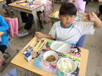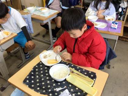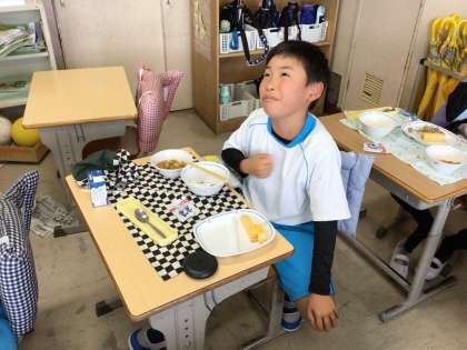 豚肉と野菜の煮物や厚焼き卵、ゆかり和えでした。この日も笑顔を絶やさずに食べていました。