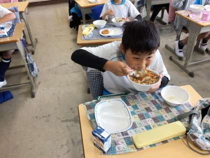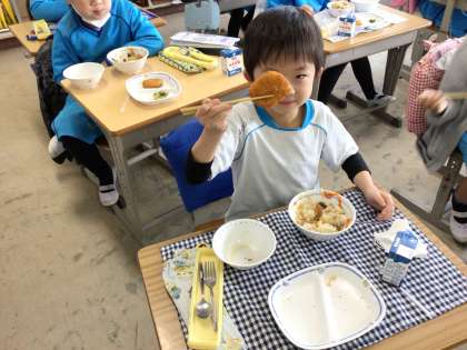 豚丼の具をご飯に混ぜて、豚丼にして食べました。チンゲンサイとツナのあえものやさつまいもコロッケも大好評でした。美味しくいただきました。