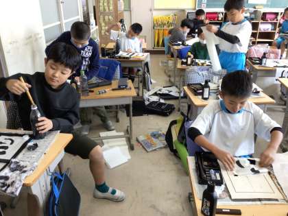 書き初めの練習をしました。ひらがな3文字の「げんき」です。今、片付けているところです。