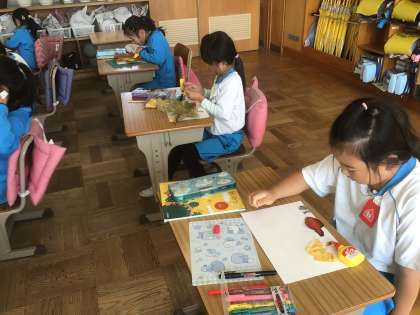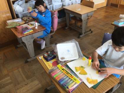 校庭や体育館裏で拾い集めた木の葉で、作りました。とっても秋を感じました。