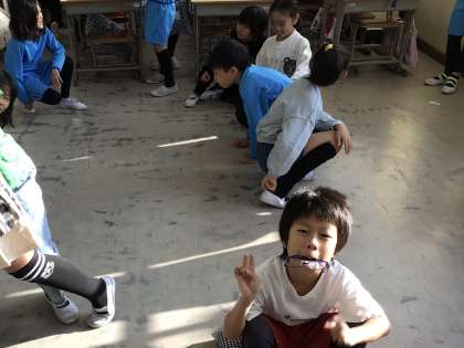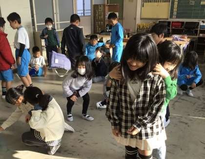 朝の会が終わった後に、机を教室の後ろに寄せて読み聞かせの準備をしています。
