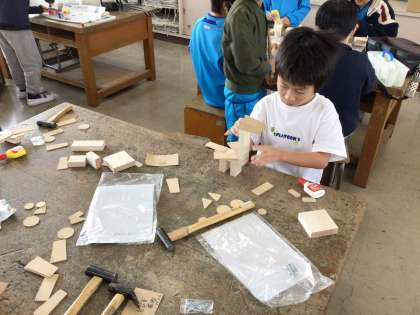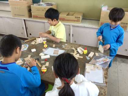 授業では「くぎうちトントン」が始まりました。木をつないで作品を作っています。