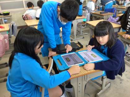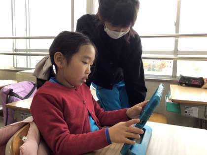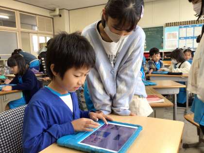 5年生がプログラミングしたアプリを3年生に優しく丁寧に教えてくれました。