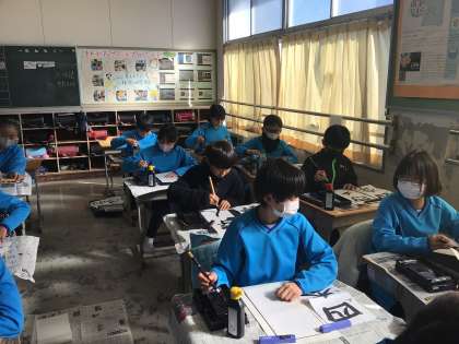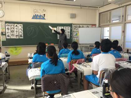 書き初めの指導のために水谷先生にお越しいただき、授業をしていただきました。文字のポイントだけでなく、肘を上げて書くことなど、さまざまなポイントを教えていただきました。