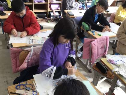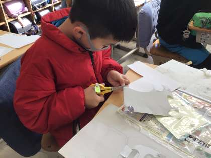 版画を作っています。下絵の形に沿って紙を切り取っています。
