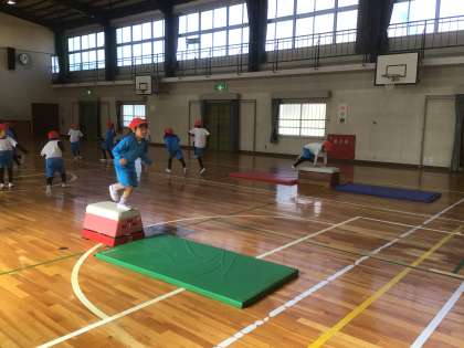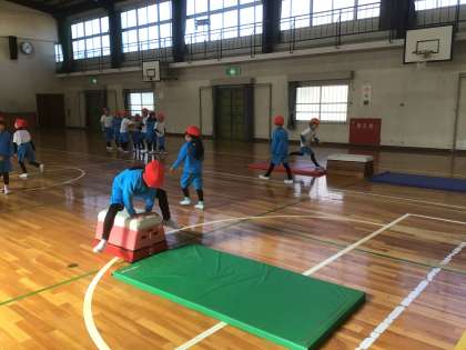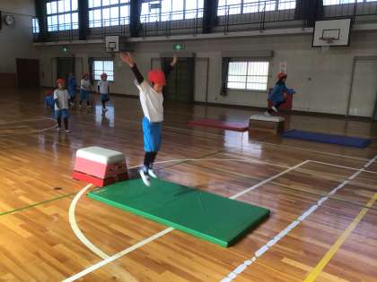 「とびばこあそび」の学習です。今日は、跳び箱にのぼったりおりたり、ジャンプしてポーズをしたりして楽しみました。準備の仕方や片付け方も、みんなで確認しながら進めました。